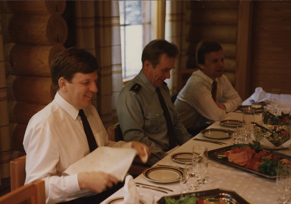 Kuva 2. Pääministeri Esko Aho ja sisäministeri Mauri Pekkarinen Rajavartiolaitoksen päällikön kenraaliluutnantti Matti Aution seurassa Nuijamaalla.