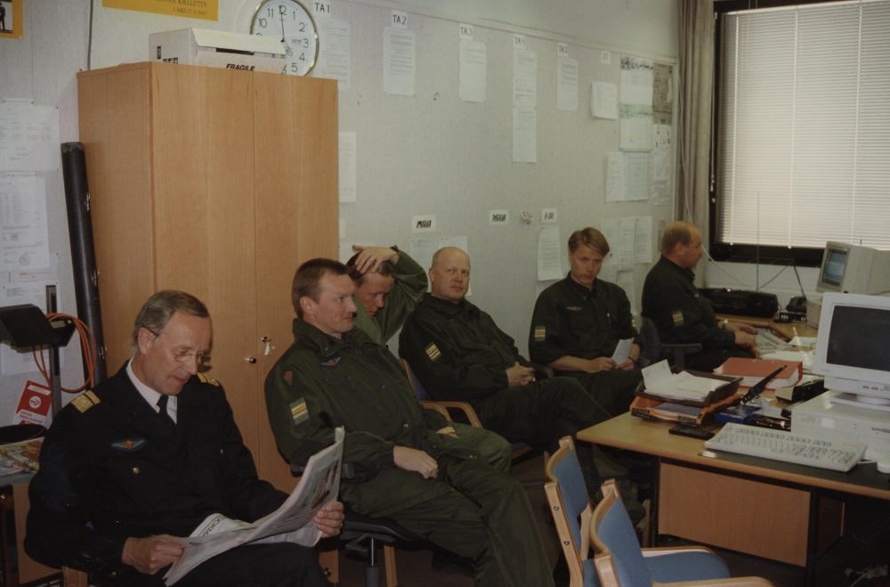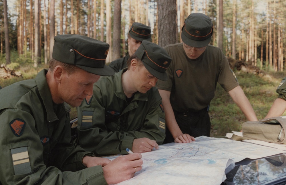 Kuva 4. Rajavartiolaitoksen upseereita seuraamassa ja johtamassa valmiusjoukkueiden harjoitustoimintaa 1990-luvun alussa.
