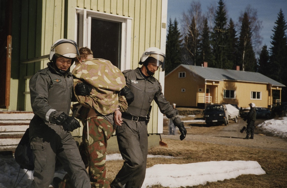 Kuva 6. Pohjois-Karjalan rajavartioston valmiusjoukkue harjoittelee laittoman rajanylittäjän kiinniottoa Lieksassa toukokuussa 1993.