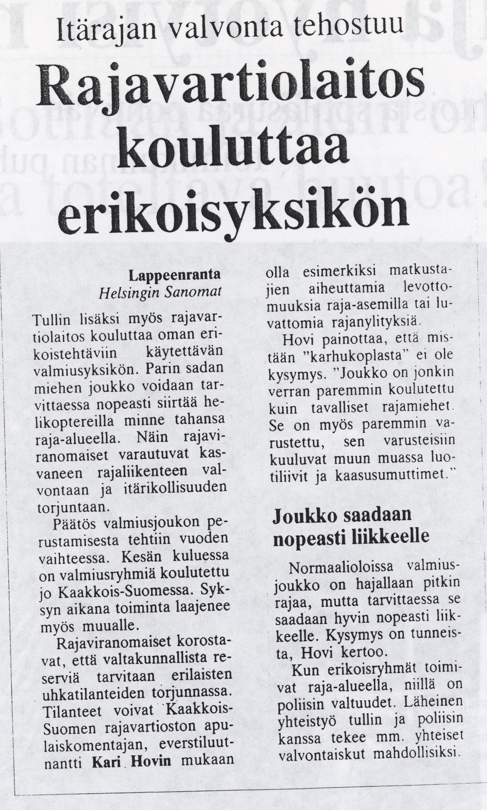 Rajavartiolaitokseen muodostettiin helmikuussa 1992 erikseen koottava erikoisosasto, jota oli tarkoitus käyttää erityisen vaativissa rajaturvallisuustehtävissä. Erikoisosasto oli tarkoitettu Rajavartiolaitoksen johdon alaiseksi valtakunnalliseksi rajavartiointireserviksi. Osastoa varauduttiin käyttämään joko kootusti tai joukkueittain hajautettuna kunkin rajavartioston komentajan suorassa alaisuudessa.