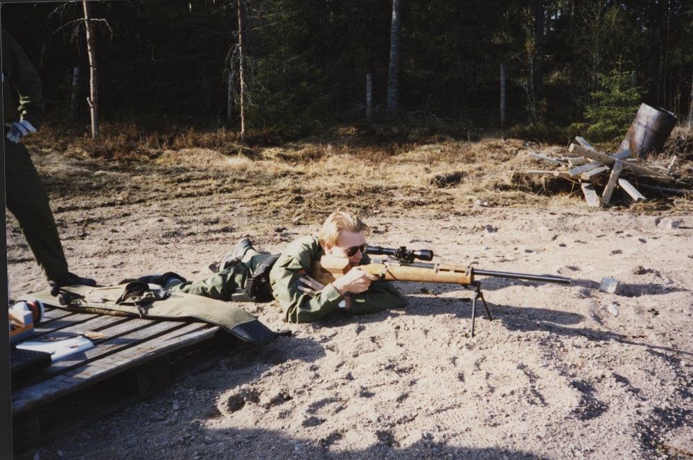 Kuva 10. Tarkka-ampujakoulutusta 1990-luvulla. Aseena kotimainen tarkkuuskivääri 85.