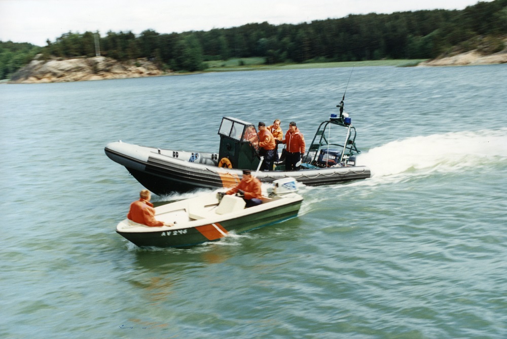 Kuva 13. Merivartiomiehet harjoittelevat valmiusveneen käsittelyä Airiston vesillä kesällä 1992. Kuva: Merivartiomuseo.