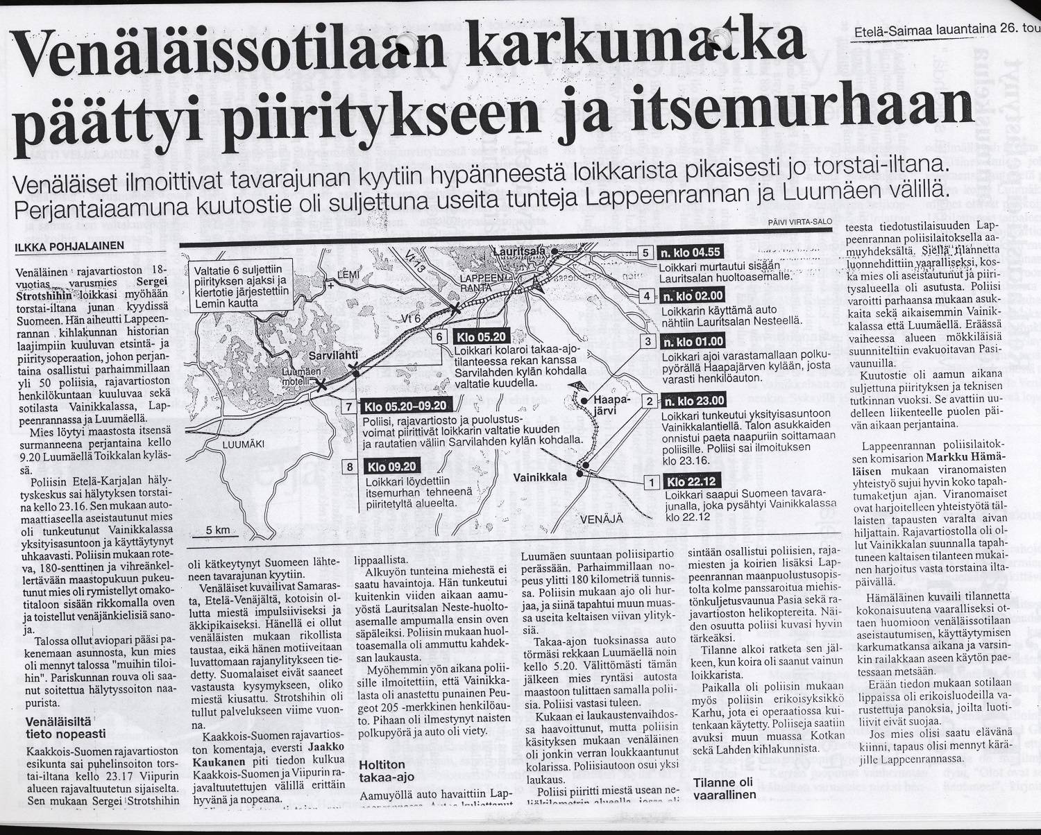 Etsinnät keskitettiin Lappeenrannan kaupungin alueelle sekä valtatie kuudelle. Etsintöihin osallistui myös paikalle lähetetty Rajavartiolaitoksen helikopteri. Strotshihin pakeni kovaa ylinopeutta ajaen valtatie kuutosta kohti Helsinkiä. Pakenija ohitti holtittomasti muuta liikennettä vaarantaen useiden sivullisten hengen. Luumäen Toikkalassa pakoauto osui rekan perävaunuun. Auto kimposi keskeltä katkenneena tien sivuun. Karkuri säilyi kuitenkin hengissä ja avasi aseellaan tulen kohti paikalle saapunutta poliisiautoa.