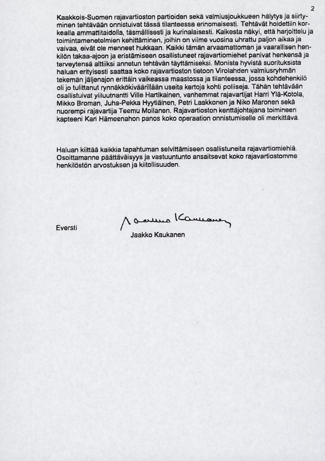 Kuvat 18 ja 19. Kaakkois-Suomen rajavartioston komentajan eversti Jaakko Kaukasen kiitoskirje. Avaa kirje pdf-tiedostona.