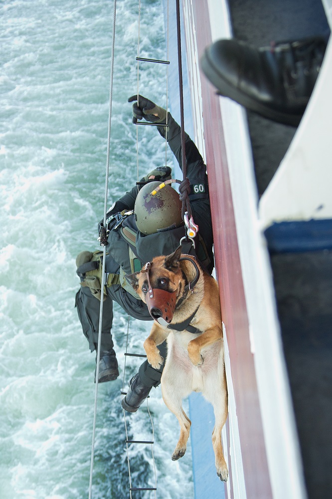 Kuva 20. Suomenlahden merivartioston viidennen valmiusjoukkueen rajakoira Remu ohjaajansa valmiusoperaattori ”Ukin” kanssa nousemassa alukseen syksyllä 2014.