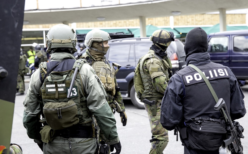 Kuva 25. Rajavartiolaitoksen, poliisin ja puolustusvoimien yhteistyötä Helsingin Olympiaterminaalissa järjestetyssä paikallispuolustusharjoituksessa vuonna 2016.